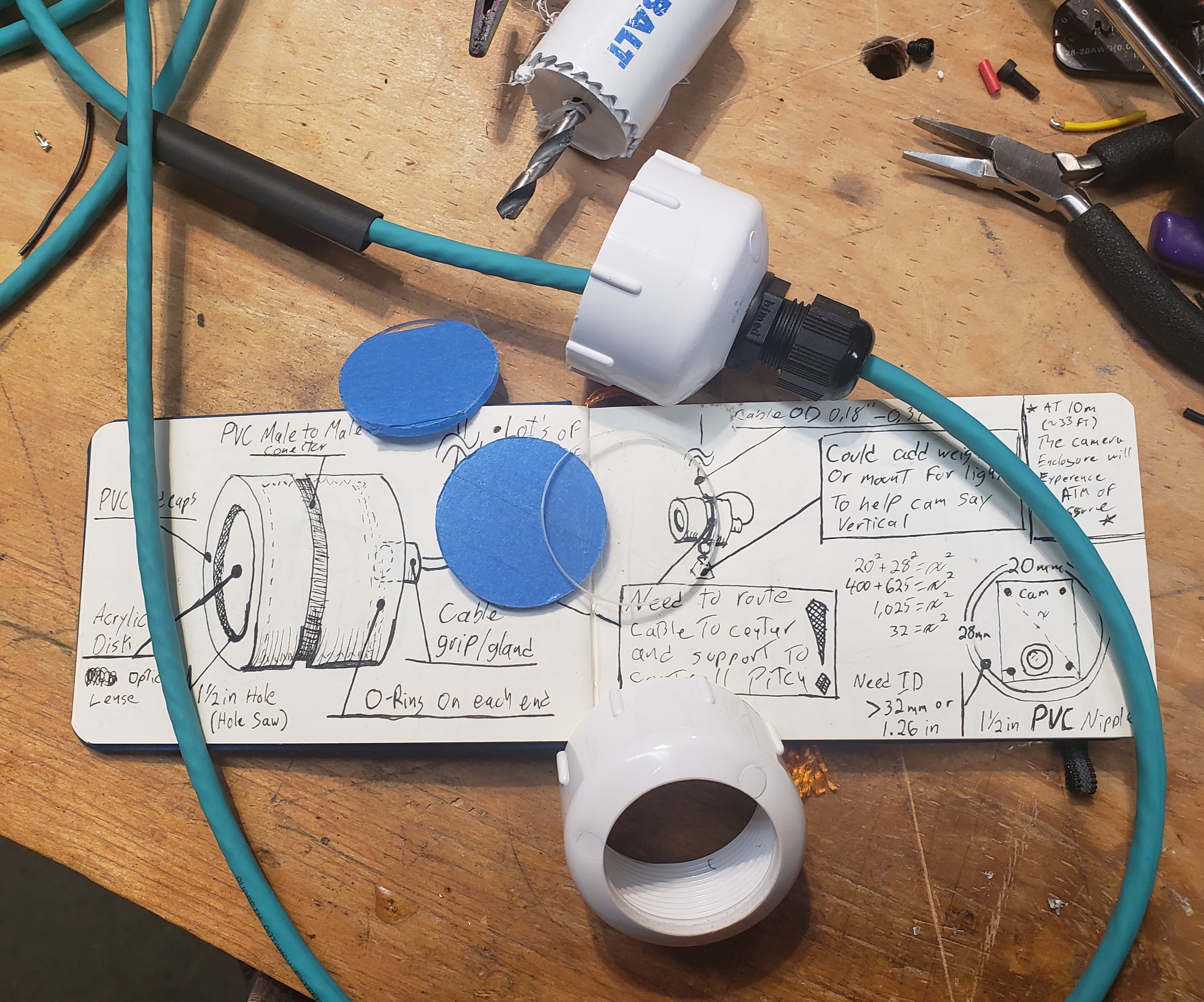 The Camera enclosure consists of two 1 1/2 in PVC caps and a 1 1/2 in CPVC threaded adapter. We drill a 3/8 in hole in one cap to fit the waterproof cable gland. The other cap gets a 1/4 in hole in the center of the cap. The lens in epoxied into the cap and the 3D printed camera mount is inserted into the CPVC adapter.