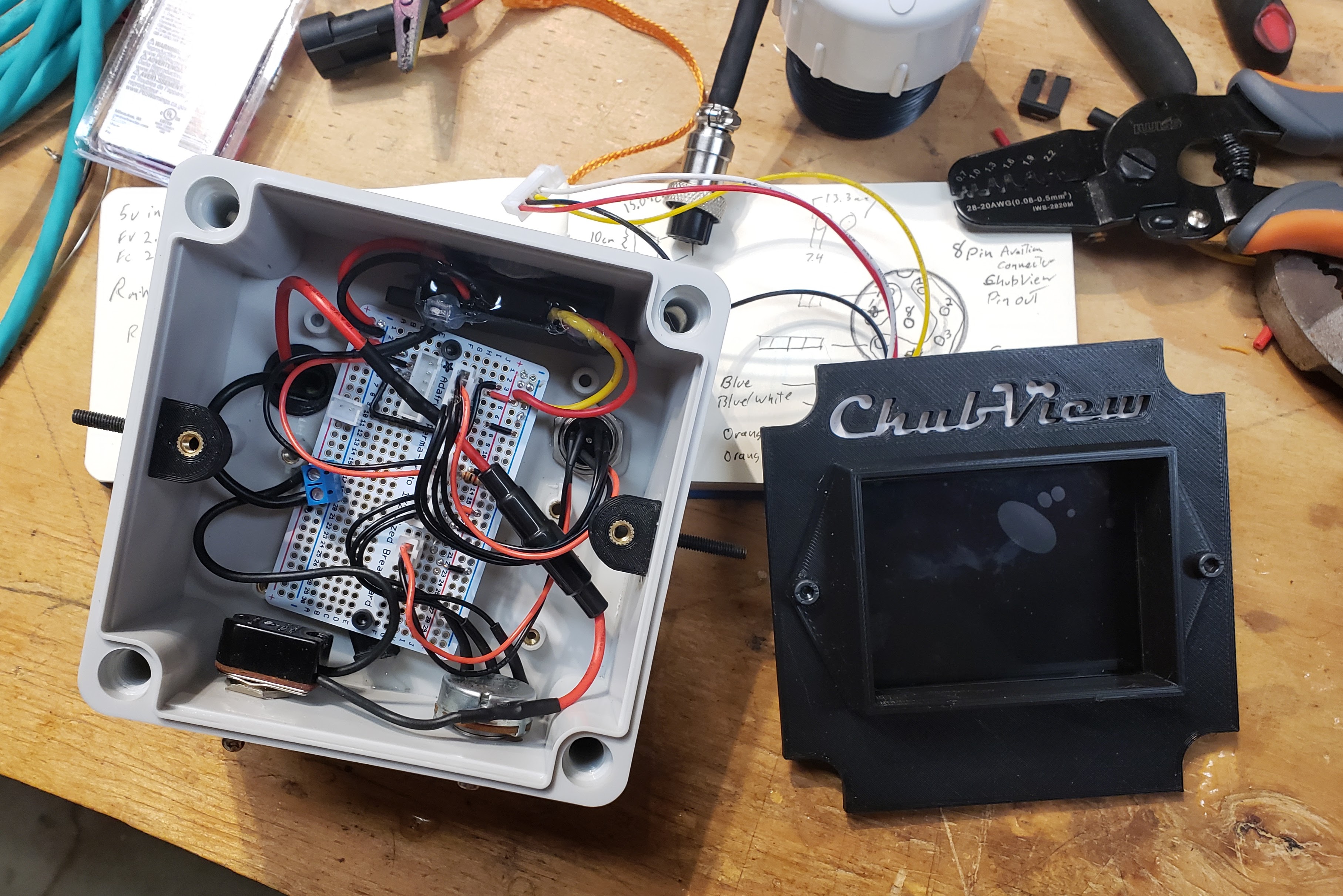 The Screen enclosure is pretty straightforward. The box is based on the LMioEtool 4.9×4.9×3 Waterproof Junction Box. Holes are drilled in the side for the bracket, in the back for the power and camera cables, and on the bottom for the power switch and LED pentameter. The rest of the screen is just a matter of installing the proto-board, wiring up everything, and assembling the printed parts. For the connection to the camera cable I used 8 pin aviation connectors and for the power in I used Nilight – 50020R 2Pin Way 16AWG Waterproof.